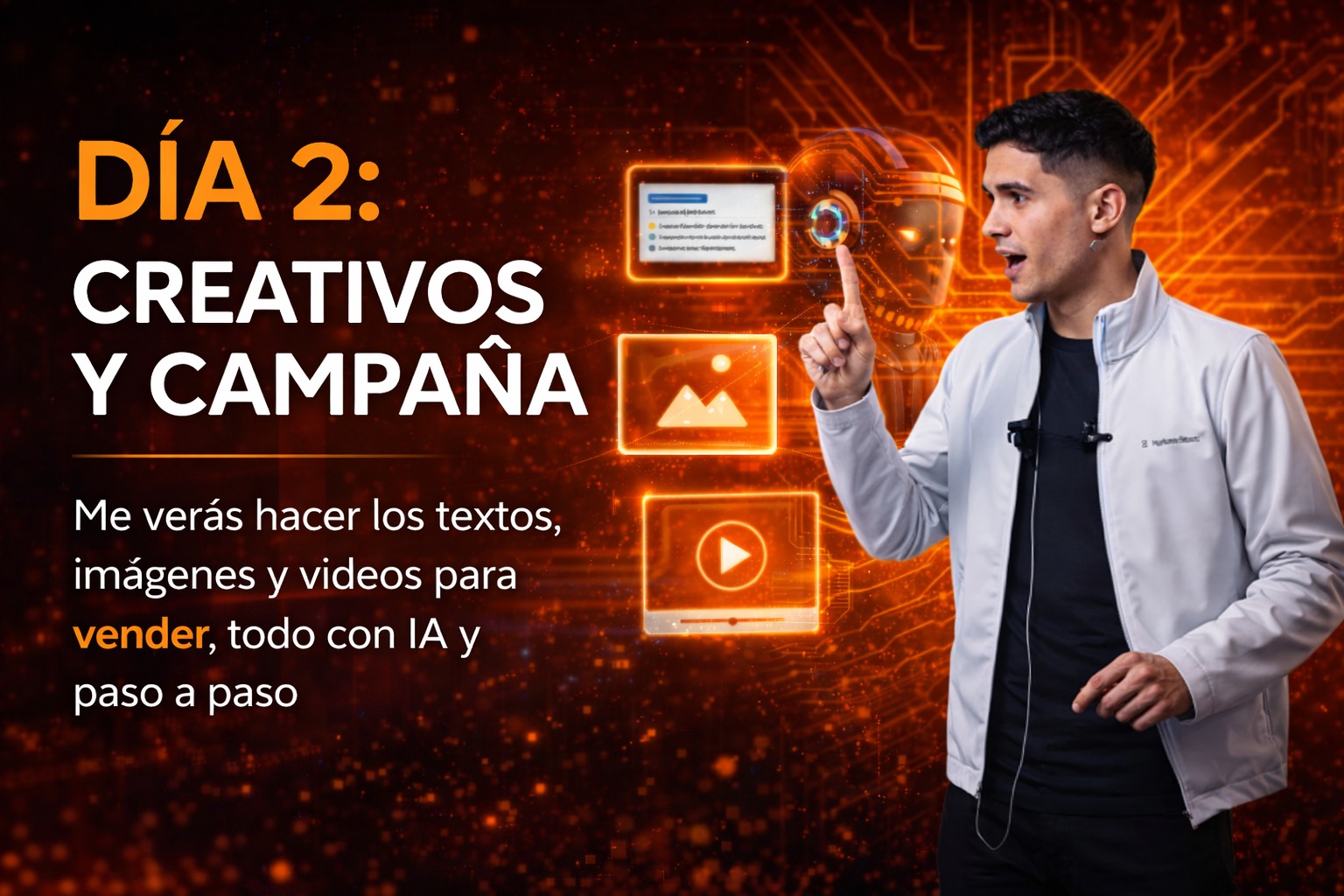 El segundo día vamos hacer que la IA cree todos los creativos... las imágenes, los textos de los anuncios... Todo lo que necesitas para que la gente quiera desesperadamente tu producto. También vamos a usar todo lo que la IA nos de para crear nuestra primera campaña de ventas.